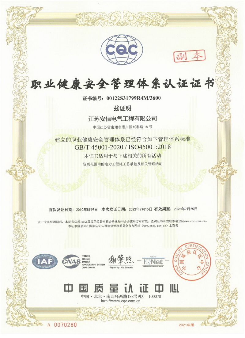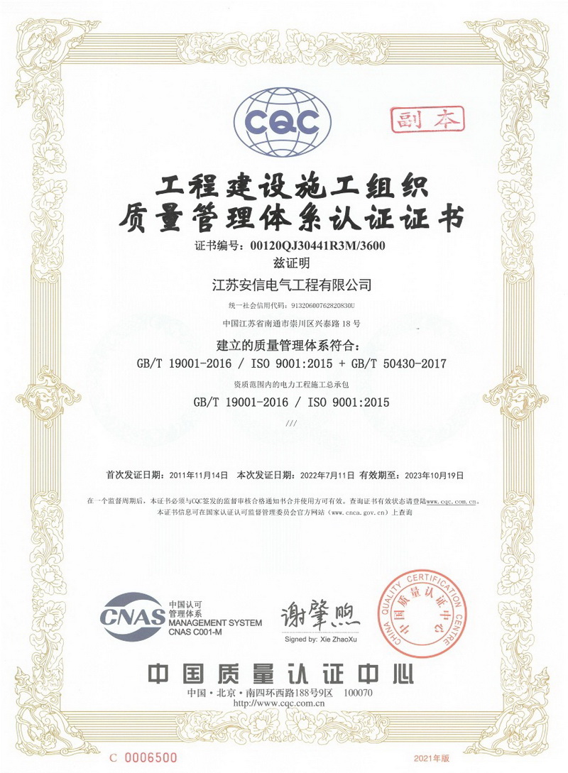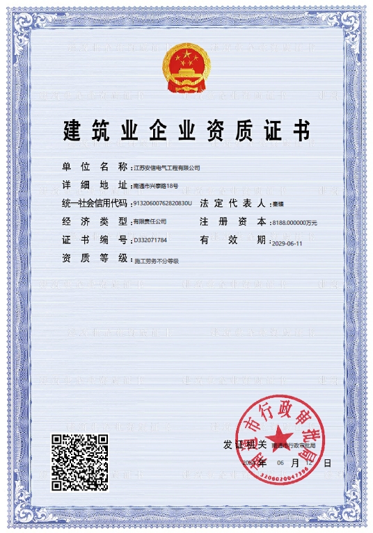 在創(chuàng)業(yè)之初,公司就堅持高起點的戰(zhàn)略思路,廣納賢才,集聚行業(yè)精英,創(chuàng)新發(fā)展,做優(yōu)企業(yè)品牌。現(xiàn)已取得:承裝二級、承修二級、承試二級,電力工程施工總承包二級,輸變電工程專業(yè)承包二級,建筑工程施工總承包二級,建筑機電安裝專業(yè)承包二級,地基基礎(chǔ)專業(yè)承包二級資質(zhì)證書,并通過了質(zhì)量、環(huán)境、職業(yè)健康和安全管理體系認(rèn)證,確保各項工作有序管控。